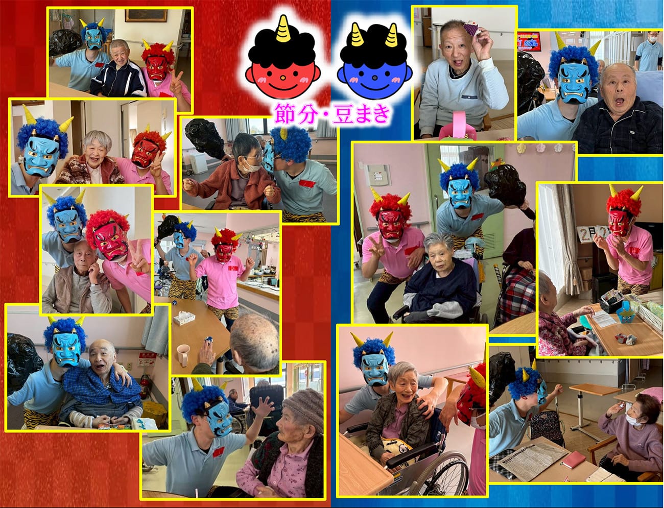 皆さんの元気な声に、赤鬼、青鬼もタジタジです。邪気も寒さも逃げ出して、心と体もポカポカに!最後に鬼と一緒に記念写真。明るい笑顔で、この冬も元気に乗り越えられます!
